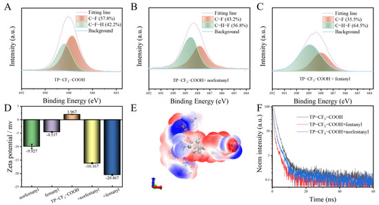 Fluorescence changes after adding (A) XPS high-resolution F1s spectra of TP-CF3-COOH probe, (B) TP-CF3-COOH + fentanyl, and (C) TP-CF3-COOH + norfentanyl. (D) Zeta potential of norfentanyl, fentanyl, TP-CF3-COOH probe, TP-CF3-COOH + fentanyl, and TP-CF3-COOH + norfentanyl. (E) The surface penetration of the electrostatic potential of TP-CF3-COOH + fentanyl. (F) The fluorescence lifetime of TP-CF3-COOH probe, TP-CF3-COOH + fentanyl, and TP-CF3-COOH + norfentanyl.