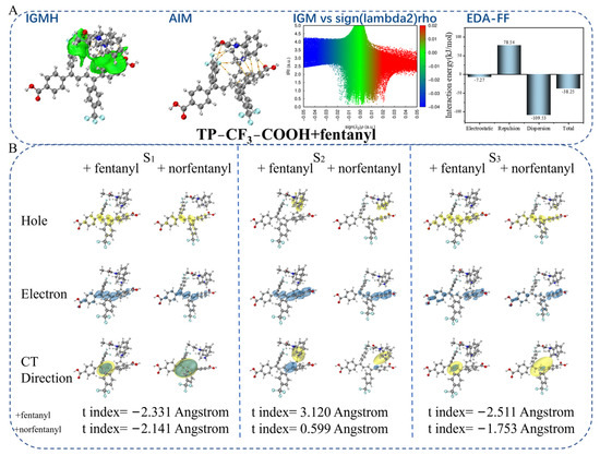 Theoretical and computational chemistry. (A) Interaction force analysis of TP-CF3-COOH + fentanyl, including IGMH, AIM, sign (lambda2) rho, and EDA-FF. (B) Hole–electron transfer diagram of TP-CF3-COOH + fentanyl and TP-CF3-COOH + norfentanyl.
