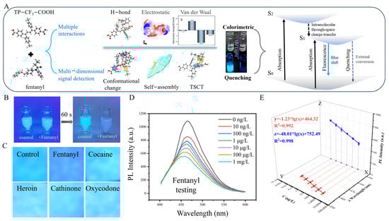 (A) Mechanism of specific recognition of TP-CF3-COOH towards fentanyl. (B) Digital image depicting the alteration in the solution vial subsequent to the addition of fentanyl. (C) Detection of 5 different kinds of drugs by TP-CF3-COOH-based test paper. (D) Quantification of fentanyl in aqueous solution. (E) Calibration curve for fentanyl detection.