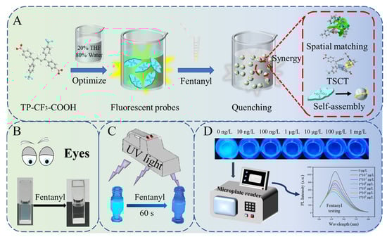 (A) Schematic diagram of the preparation of the TP-CF3-COOH probe and the application mechanism for fentanyl detection. (B) Visual colorimetry for qualitative detection. (C) UV light for qualitative detection of fentanyl. (D) Portable microplate reader for quantitative detection of fentanyl.