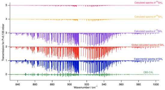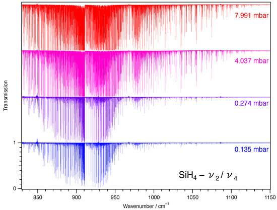 The line intensities were measured using a multi-spectrum fitting program developed in Paris and previously used in several studies [28,29,30]. In this work, this program was applied to simultaneously fit 8 (for the strong band) or 5 (for the weaker band) experimental spectra of SiH4, constraining the fit of a transition by using the same set of line parameters for the calculation of this transition observed under various experimental conditions. Each synthetic spectrum is calculated as the convolution of the molecular transmission spectrum with an instrument line shape function, which includes the effects of the finite maximum optical path difference and the finite source aperture diameter of the interferometer. In the present work, no deviation from this model instrument line shape was observed using the nominal aperture diameter of . The molecular transmission spectrum was generated on a wavenumber scale interpolated with respect to that of the corresponding observed spectrum. After convolution with the instrument line shape function, only the calculated spectral points corresponding to observed spectral points were retained. The background in each spectrum was represented by a polynomial expansion up to the second order (a constant or an affine function was, however, found sufficient in most cases), and the profile of the lines was modeled using a Voigt function with Gaussian width always held fixed to the value calculated for the Doppler broadening. The measurements were carried out on spectrally restricted intervals, ranging from 0.015 to 0.1 cm−1 and containing either a single or several lines. The fitted line parameters were the positions, intensities, and self-broadening coefficients. The self-broadening and self-shift coefficients of all the lines were set to 0.1 and 0.0 cm−1.atm−1, respectively. Figure 2 shows an example of this multi-spectrum analysis for a small part of the band.