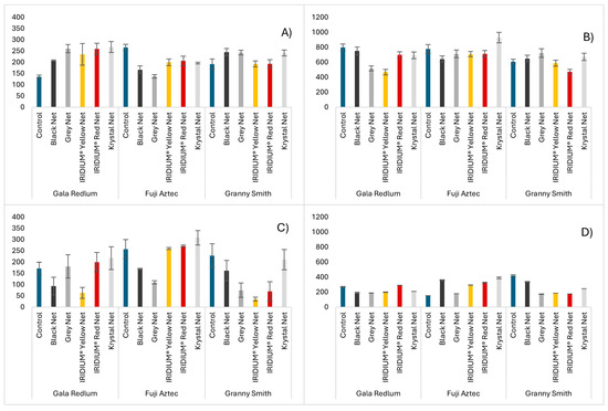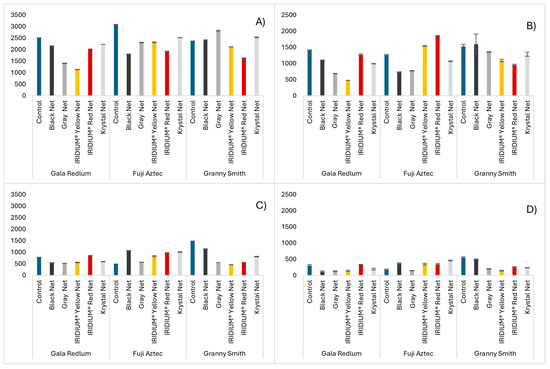 - Boini, A.; Bresilla, K.; Perulli, G.D.; Manfrini, L.; Corelli Grappadelli, L.; Morandi, B. Photoselective Nets Impact Apple Sap Flow and Fruit Growth. Agric. Water Manag. 2019, 226, 105738. [Google Scholar] [CrossRef]