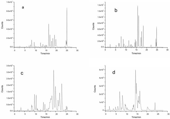 TIC of different chromatographic columns on the separation of phenolic compounds by HPLC-MS/MS. (a) ZORBAX Extend-C18 column; (b) Infinity Lab Poroshell 120 EC-C18 column; (c) ZORBAX SB-C18 column; (d) ZORBAX SB-Aq C18 column.