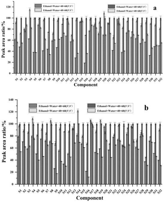 Taking the response peak area of each component upon extraction with 80% ethanol as references, the response peak area of each component and its ratio upon extraction with other solvents were plotted as the vertical coordinate, with the component name on the horizontal coordinate. As shown in Figure 3, when anhydrous ethanol was used as the solvent, the response peak area ratios of black wolfberry ranged from 34.0% to 94.5%, among which 19 components had ratios less than 70%; the response peak area ratios of red wolfberry ranged from 17.6% to 96.1%, and 26 components had ratios less than 70%; the response peak area ratios of mulberry ranged from 14.5% to 82.2%, and 30 components had ratios less than 70%; and the response peak area ratios of sea buckthorn ranged from 20.3% to 95.5%, and 23 components had ratios less than 70%. When 40% ethanol was used as the solvent, the response peak area ratios of L. barbarum ranged from 18.8% to 97.8%, and 23 components had ratios less than 70%; the response peak area ratios of L. barbarum ranged from 21.4% to 106.3%, and 16 components had ratios less than 70%; the response peak area ratios of mulberry were between 11.0% and 81.8%, and 28 components had ratios less than 70%; and the response peak area ratios of sea buckthorn ranged from 21.7% to 115.5%, of which 22 components had a ratio less than 70%. When 60% ethanol was used as the solvent, the response peak area ratios of black wolfberry ranged from 65.5% to 115.6%, and there were two components with ratios less than 70%; the response peak area ratios of red wolfberry ranged from 44.5% to 122.1%, and five components had ratios less than 70%; the response peak area ratios of mulberry ranged from 54.4% to 108.9%, and two components had ratios less than 70%; and the response peak area ratios of sea buckthorn ranged from 60.9% to 111.9%, and five components had ratios less than 70%. In summary, the extraction efficiencies of the 40% ethanol solution and pure ethanol solution were low, whereas the extraction efficiencies of 60% ethanol and 80% ethanol were high, with the greatest extraction efficiency observed with 80% ethanol. These results may be because the polyphenolic compounds in the berries more easily dissolve in solutions with a high proportion of ethanol.