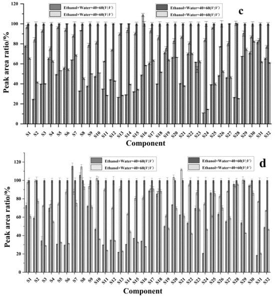 Effects of different extraction solvents on the extraction efficiency of phenolic compounds (a) black wolfberry; (b) red wolfberry; (c) mulberry; (d) sea buckthorn. S1: arbutin, S2: gallic acid, S3: 4-hydroxybenzoic acid, S4: epigallocatechin, S5: neochlorogenic acid, S6: D-quinic acid, S7: catechin, S8: caffeic acid, S9: syringic acid, S10: epicatechin, S11: p-coumaric acid, S12: vanilloid acid, S13: 7-hydroxycoumaric acid, S14: chlorogenic acid, S15: ferulic acid, S16: sinapic acid, S17: rutin, S18: isoferulic acid, S19: hyperoside, S20: isoquercitrin, S21: quercetin 3-O-β-D-xylopyranoside, S22: guaijaverin, S23: salicylic acid, S24: kaempferol 3-rutinoside, S25: narcissin, S26: astragalin, S27: isorhamnetin 3-O-galactoside, S28: isorhamnetin 3-O-glucoside, S29: phloridin, S30: cinnamic acid, S31: naringin, and S32: isorhamnetin.