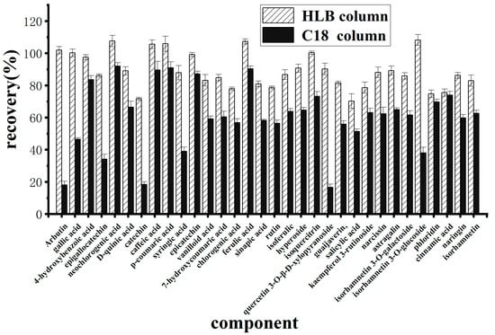 Owing to the complexity and high sugar content of the berry matrix, the use of a solid-phase extraction column to remove matrix interference aids in the accurate quantification of polyphenolic compounds in a sample. To ensure good adsorption of polyphenolic compounds to the HLB and C18 solid-phase extraction columns, an acidic aqueous solution was used to dissolve the polyphenolic compounds because they contain phenolic hydroxyl groups. The results (Figure 4) revealed that when a C18 column was used for purification, the recoveries of arbutin, gallic acid, epigallocatechin, catechin, eugenic acid, isoquercetin-3-O-β-xyloside, and isorhamnose-3-O-glucoside were all less than 50%. However, when the HLB column was used, the recoveries of the 32 polyphenolic compounds ranged from 70.3% to 108.2%.