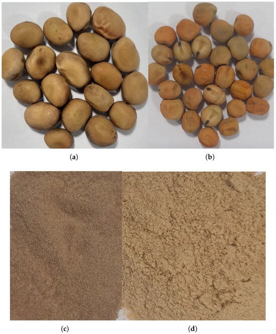 Field bean and Field pea seed and protein isolate. (a) dried seeds of field bean, (b) dried seeds of field pea, (c) protein isolate of field bean, (d) protein isolate of field pea.