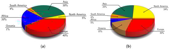 Global production distribution of field bean and field pea by region [38]. (a) Field bean, (b) Field pea.