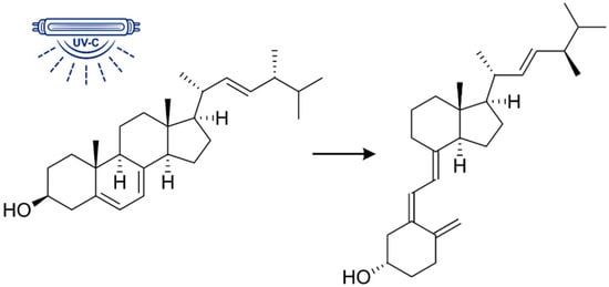 Another important aspect is the ultraviolet radiation-assisted conversion of ergosterol to ergocalciferol, i.e., vitamin D2, by photochemical bond breaking of a steroid (Figure 1) [8,9,10]. When the mushroom powder was directly irradiated with UV-C radiation (254 nm), a 16% decrease in ergosterol and thus an increase in vitamin D2 was observed. A similar trend was observed when it was irradiated with UV-B (310 nm), while no conversion of ergosterol to vitamin D2 was observed when it was irradiated with UV-A (365 nm) [10].