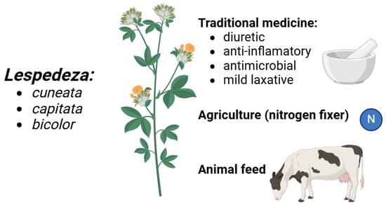 Particularly in East Asia, traditional medicine heavily relies on Lespedeza species—especially L. cuneata (Sericea lespedeza). Lespedeza has been used in Chinese herbal therapy for its supposed diuretic and cleansing effects, assisting in renal function and water retention reduction. Particularly in situations of edema and fluid retention, the plant is also used to treat urinary tract infections and hence ease inflammation. Lespedeza is used in traditional medicine in Korea and Japan to treat disorders like skin rashes and inflammatory diseases and to improve liver function [,,,,,]. Its high tannin concentration also helps with astringency and antibacterial properties, assisting in wound healing and avoiding infections. Certain species within the genus are also used in folk medicine to support digestive health; they are said to calm the gastrointestinal system and function as a mild laxative. Like many plants in the Fabaceae family, Lespedeza species have multiple uses (Figure 1): they not only increase soil fertility via nitrogen fixation but also are renowned for their part in sustaining human health throughout many traditional medicine systems [,,,,].
