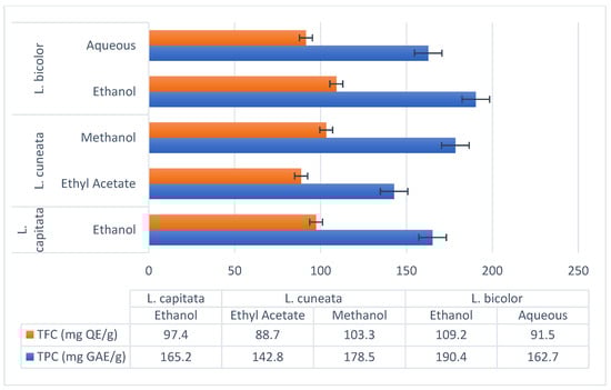 In research on L. bicolor, extraction methods consisted of both water and ethanol. Here, Tarbeeva et al. (2019) examined the conventional method of aqueous infusion [], while Ren et al. (2023) optimized ethanol extraction for higher flavonoid yield []. As a result of the extraction, the ability of ethanol to dissolve both hydrophilic and lipophilic flavonoids, and the TPC and TFC values were higher, but the extraction efficiency was significantly different.