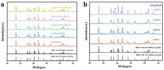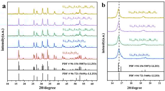 The X-Ray diffraction (XRD) patterns of both the pure LLZO and Fe3+ and Bi3+ co-doped LLZO with varying electrolyte powder compositions after pre-treatment at 900 °C are shown in Figure 1a,. Following pre-sintering, the XRD patterns of the electrolyte powders reveal a predominant tetragonal phase, with no observable impurity phases, which is consistent with the standard diffraction pattern (PDF # 96-154-5087).