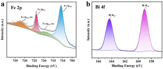 Spin-orbit splitting, similar to Fe 2p, has been observed in the Bi 4f spectrum, as shown in Figure 3b. The binding energy peaks around 159.0 eV are assigned to Bi 4f7/2, while those around 164.3 eV correspond to Bi 4f5/2. These binding energies are consistent with the Bi3+ oxidation state.