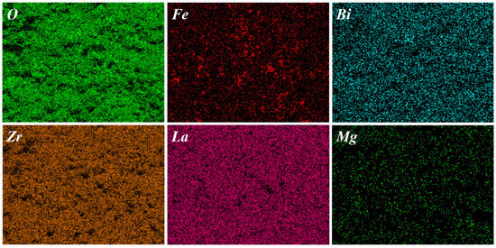 Figure 6 displays the EDS elemental mapping images of the Li6.5Fe0.2La3Zr1.9Bi0.1O12 electrolyte sample. All constituent elements exhibit a homogeneous spatial distribution without detectable aggregation. As summarized in Table 1, the sample contains a trace amount of Mg (0.11%). Notably, Mg incorporation effectively inhibits the reaction of LLZO with atmospheric H2O and CO2, thereby enhancing its air stability [31].