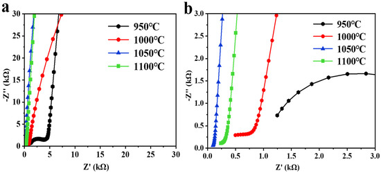 The electrochemical impedance spectra of Li6.5Fe0.2La3Zr1.9Bi0.1O12 ceramic pellets at different sintering temperatures are shown in Figure 7. The Nyquist plots of LLZO typically exhibit two distinct semicircles in the high-frequency region, which correspond to the grain resistance and grain boundary resistance, and a sloping line in the low-frequency region, representing the blocking response of the silver electrode to the lithium ions [45]. This is a characteristic behavior of LLZO-based solid electrolytes: the semicircles corresponding to the grain and the grain boundary resistances are often not clearly discernible in the impedance spectra. This absence can be attributed to the narrow detection range (0.1 Hz–1 MHz) of the impedance spectroscopy instrument, which may cause some arcs to fall outside the detectable frequency range. As shown in Figure 7a, at 950 °C, a large semicircular arc appears in the electrochemical impedance spectroscopy (EIS) spectrum due to the low density of the ceramic pellets and the presence of a minor fraction of the tetragonal phase in the sample. At this temperature, the ionic conductivity is 3.90 × 10−5 S·cm−1.