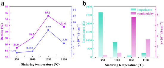 The effect of different sintering temperatures on the properties of Li6.5Fe0.2La3Zr1.9Bi0.1O12 pellets: (a) ionic conductivity (σ) and ceramic density, and (b) impedance and ionic conductivity (σ).