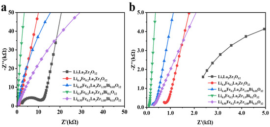 Figure 9 presents the electrochemical impedance spectroscopy (EIS) data for both undoped LLZO and the Bi3+/Fe3+ co-doped Li6.4+xFe0.2La3Zr2-xBixO12 (x = 0, 0.05, 0.1, 0.15) solid electrolytes. The undoped LLZO, which primarily adopts the tetragonal phase, exhibits an ionic conductivity of 1.01 × 10−5 S·cm−1. This value aligns with previously reported ionic conductivities for tetragonal-phase LLZO, confirming the consistency of the results [46]. As shown in Figure 9a, Fe3+ doping promotes the stabilization of the cubic phase of LLZO, while the tetragonal phase gradually diminishes. The cubic phase of LLZO, characterized by a higher concentration of lithium vacancies, facilitates enhanced Li+ ion conduction due to the expansion of the Li+ transport pathways [47,48,49,50]. As a result, the enhanced ionic conductivity of the ceramic samples compared with pure LLZO is primarily attributed to the increased Li vacancy concentration induced by Fe3+ doping in the LLZO matrix, while the improved relative density of the specimens synergistically contributes to the overall conductivity enhancement through microstructural optimization. By varying the Bi3+ doping levels in Li6.4Fe0.2La3Zr2O12, the ionic conductivity can be further improved. The highest ionic conductivity of 7.57 × 10−4 S·cm−1 is observed when the Bi3+ doping level is approximately 0.1 (see Figure 9b). This improvement is attributed to the substitution of Zr4+ by Bi3+, which introduces additional lithium ions into the lattice, ensuring charge conservation and enhancing the lithium-ion continuity within the transport channels. Additionally, the larger ionic radius of Bi3+ (1.03 Å) compared with Zr4+ (0.84 Å) results in an increased lattice constant, which further widens the Li+ migration channels.