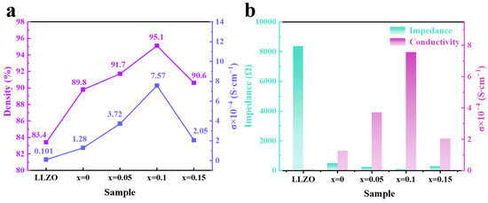 Figure 10 illustrates the relationship between density, ionic conductivity, and impedance for both LLZO and Li6.4+xFe0.2La3Zr2-xBixO12 (x = 0, 0.05, 0.1, 0.15). As shown in Figure 10a, both the density and ionic conductivity of the electrolyte pellets increase with the doping concentration of Bi3+. However, when the Bi3+ doping level reaches 0.15, a significant amount of Bi3+ replaces Zr4+, leading to an increased lithium content in the lattice and a reduction in the concentration of lithium vacancies. This results in a decrease in ionic conductivity, which drops to 2.05 × 10−4 S·cm−1. Moreover, excessive Bi3+ doping lowers the densification temperature of the electrolyte pellets, causing over-sintering and significant lithium volatilization at elevated temperatures. This leads to the formation of pores within the electrolyte’s structure, reducing densification and increasing impedance (see Figure 10b).