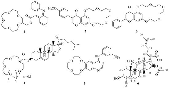 Natural product-linked crown ethers. Acridine crown ethers (anti-cancer) 1 [], Biochanin A-linked crown ether (anti-cancer) 2 [], Chrysin-linked crown ether (antidiabetic) 3 [], Cholesteryl-linked crown ether (transfection activity in HEK293 cells) 4 [], Anilino-quinazoline-linked crown ether (EGFR inhibition) 5 [], Fusidic acid (antiplasmodial activity) 6 [].