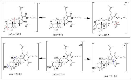 Electrospray ionization mass spectrometry (ESIMS) is a soft ionization technique that enables most of the molecules to be analyzed without significant structural changes. The ESIMS method was used to confirm the molecular masses of prepared crown molecules (dissolved in methanol), which resulted in the formation of common fragments, for example, M-H, M-COCH3, M-OCOCH3, and M-{(O-C2H4)n-O}, where M is the molecular mass of the crown 10a–d (Scheme 2). The formation of fragment ion with the loss of -2OH groups corresponding to [C35H54O4] at m/z = 538.5 is the most stable ion that appeared as base ion peak in the spectrum of precursor, i.e., FABE 8 and also appeared in the spectrum of crown molecules generally, at m/z = 538.5 as a base peak with the loss of crown chain -On-(C2H4)n-O-. Further fragmentation with the loss of acetyl, i.e., M-COCH3, or loss of acetyloxy, i.e., M-OCOCH3, is another most common fragmentation pattern that was observed in the ESIMS spectrum of Fusidic acid butyl ester and of all crown molecules. The comparative ESIMS analysis of crown (FABE-13-crown-3) 10a, with FABE 8 and the primary fragment ions generated under ESI conditions are shown in Figure 3.