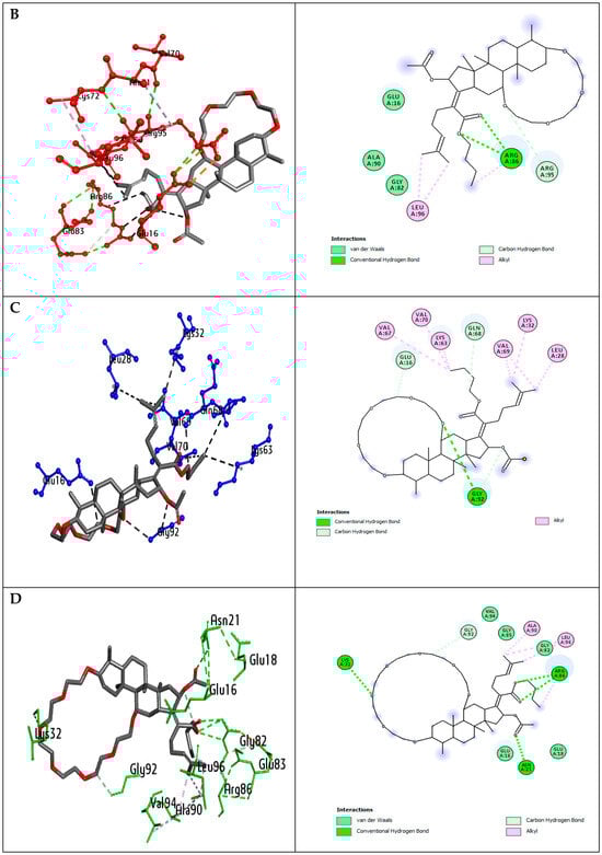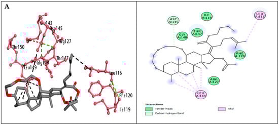 All the docked crown ether compounds showed the same pattern of alkyl bond interactions involving C-26 and C-27 with Leu A:96 or Leu A:28. Generally, these weak interactions of alkyl bonds typically support the attachment of the ligands to the binding site of the receptor and contribute to the stabilization of receptor–ligand interaction. It is important to note that the experimentally most active compound (FABE-19-crown-5) 10c showed the highest number of alkyl bond interactions (06) involving C-26, C-27 with Lys A:32, Val A:69, and Leu A:28; and involving CH3 group of –COOC4H9 interacting with Lys A:63, Val A:69, and Val A:70. Interestingly, (FABE-19-crown-5) 10c, showed the least number of conventional hydrogen bond interaction (01), involving oxygen of crown chain with Gly A:92. Rest of the interactions are three (03) carbon hydrogen interactions involving CH2 of –COOC4H9 with Gln A:68, oxygen of CH3COO- with Gly A:92, and carbon of crown chain with Glu A:16. These interactions showed the importance of butyl ester fragment and the crown ether moiety for the binding with protein. Similarly, the second most active compound (FABE-16-crown-4) 10b showed only two conventional hydrogen bond interactions and 03 alkyl bond interactions (see Supplementary Materials). All other molecules with more conventional hydrogen bond interactions have been found experimentally to be less active. This pattern suggested that increased hydrogen bonds could significantly enhance the binding affinity between the molecule and the protein. Such strong interactions may lead to a more stable complex, inhibiting the molecule’s ability to respond effectively. Understanding this relationship is crucial for developing strategies to overcome resistance mechanisms in drug design.