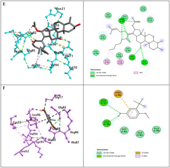 (A–F): Binding interactions of compound 10a (A), 10b (B), 10c (C), 10d (D), 8 (E), and standard compound BHA (F) against human antioxidant protein peroxiredoxin 5.