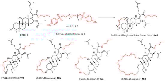 Fusidic acid is a natural triterpene and a clinical medicine for various illnesses that include Clostridium difficile colitis, respiratory problems, cystic fibrosis, surgical prophylaxis, leprosy, as well as ophthalmic and neurological conditions [], bacterial conjunctivitis [], bone and joint infections [,,], and soft-tissue infections [,]. However, the literature shows that Fusidic acid suffers from a narrow spectrum of biological properties and thus requires structural modification to expand its scope and potentially introduce new pharmacology [,]. For this purpose, various modification sites of Fusidic acid were focused, including C-3, C-11, C-16, C-17, C-20, C-21, C-24, and C-25, which often led to derivatives with comparatively higher biological activities. In this domain, various Fusidic acid C-21 ester derivatives were established to have meaningful antibacterial, antitumor, and anti-parasitic outcomes [,]. Motivated by the significance of crown ethers in the field of medicine and clinical effectiveness of Fusidic acid 6 (Figure 1 and Scheme 1) and its derivatives, we designed Fusidic acid C-21 butyl ester (FABE) 8 linked crown ethers of the type 10 (Scheme 2), to improve or add new pharmacology to Fusidic acid. This study focused on the novel modification of hydroxyl groups present at C-3 and C-11 positions of C-21 Fusidic acid butyl ester (FABE 8, Scheme 2) by linking various flexible crown ether chains, and on discovering the biological properties of the resulting crown scaffolds.