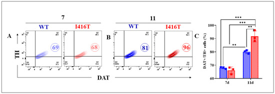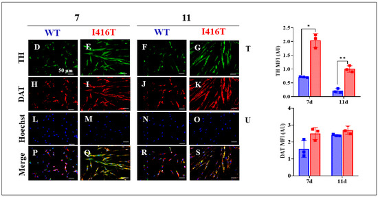 We first investigated whether MenSCs are capable of transdifferentiating into DALNs. As shown in Figure 1, both WT and mutant cells expressed the typical dopaminergic lineage markers tyrosine hydroxylase (TH) and dopamine transporter (DAT) by 69%, according to flow cytometry analysis (Figure 1A,C). As these cells stained for the double marker TH/DAT, which are involved in dopamine synthesis [38] and transport [39], the cells could be classified as dopaminergic-like neurons (DALNs) in nature. To further evaluate whether a change in culture conditions affects such a transdifferentiation process, DALNs cultured on day 7 were exposed to minimal culture medium (MCm) containing fetal bovine serum (1% FBS) and low-glucose DMEM for an additional 4 days. Figure 1B shows that both WT and mutant DALNs significantly expressed 81% and 96% TH/DAT-positive cells, respectively; however, mutant DALNs expressed more TH/DAT than WT DAergic neurons (Figure 1C). Similar results were obtained by fluorescence microscopy analysis (Figure 1D–U).