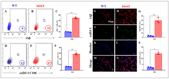 PSEN1 I416T DALNs express abundant iAβ and shows oxidation of DJ-1 after 11 days of transdifferentiation. Representative flow cytometry contour plots show intracellular amyloid-beta (iAβ) in (A) WT PSEN1 and (B) PSEN1 I416T DALNs. (C) Percentage of intracellular amyloid-beta (iAβ). Representative flow cytometry contour plots show oxidized protein DJ-1 (DJ-1 C106-SO3) in (D) WT PSEN1 and (E) PSEN1 I416T DALNs. (F) Percentage of oxDJ-1 (DJ-1 C106-SO3). WT PSEN1 and PSEN1 I416T DALNs were stained with primary antibodies against iAβ (G,H), oxDJ-1 (I,J), Hoechst (K,L), and merged (M,N). Positive red fluorescence reflects the cytoplasmic presence of iAβ protein, positive green fluorescence reflects the cytoplasmic presence of oxDJ-1, and positive blue fluorescence reflects nuclei. Quantification of the (O) iAβ and (P) oxDJ-1 mean fluorescence intensity (MFI). The figures represent one out of three independent experiments. One-way ANOVA followed by Tukey’s test. The data are expressed as the mean ± SD of three independent experiments (n = 3); * p < 0.033 (P), ** p < 0.01. (C,F), ** p < 0.002 (O). Bars in blue represent WT cells. Bars in red represent mutant cells. Image magnification, 200×.