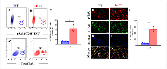 PSEN1 I416T DALNs shows high levels of phosphorylated protein TAU (pS202/T205-TAU) after 11 days of transdifferentiation. Representative flow cytometry contour plots show intracellular pS202/T205-TAU in (A) WT PSEN1 and (B) PSEN1 I416T DALNs. Representative flow cytometry contour plots show total TAU protein (t-TAU) in (A’) WT PSEN1 and (B’) PSEN1 I416T DALNs. (C) Percentage of p-TAU/t-TAU ratio. WT PSEN1 and PSEN1 I416T DALNs were stained with primary antibodies against pS202/T205-TAU (D,E), t-TAU (F,G), Hoechst (H,I), and merged (J,K). Positive red fluorescence reflects the cytoplasmic presence of pS202/T205-TAU protein, positive green fluorescence reflects the cytoplasmic presence of t-TAU, and positive blue fluorescence reflects nuclei. (L) Quantification of the pS202/T205-TAU/t-TAU ratio mean fluorescence intensity (MFI). The figures represent one out of three independent experiments. One-way ANOVA followed by Tukey’s test. The data are presented as the mean ± SD of three independent experiments (n = 3); * p < 0.05, ** p < 0.002. Bars in blue represent WT cells. Bars in red represent mutant cells. Image magnification, 200×.