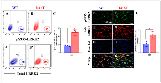 PSEN1 I416T DALNs increase levels of phosphorylated protein LRRK2 (pS935-LRRK2) after 11 days of transdifferentiation. Representative flow cytometry contour plots show intracellular pS935-LRRK2 in (A) WT PSEN1 and (B) PSEN1 I416T DALNs. Representative flow cytometry contour plots show total LRRK2 protein (t-LRRK2) in (A’) WT PSEN1 and (B’) PSEN1 I416T DALNs. (C) Percentage of pS935-LRRK2/t-LRRK2 ratio. WT PSEN1 and PSEN1 I416T DALNs were stained with primary antibodies against pS935-LRRK2 (D,E), t-LRRK2 (F,G), Hoechst (H,I), and merged (J,K). Positive green fluorescence reflects the cytoplasmic presence of pS935-LRRK2 protein, positive red fluorescence reflects the cytoplasmic presence of t-LRRK2, and positive blue fluorescence reflects nuclei. (L) Quantification of the pS935-LRRK2/t-LRRK2 ratio mean fluorescence intensity (MFI). The figures represent one out of three independent experiments. One-way ANOVA followed by Tukey’s test. The data are presented as the mean ± SD of three independent experiments (n = 3); * p < 0.033. Bars in blue represent WT cells. Bars in red represent mutant cells. Image magnification, 200×.