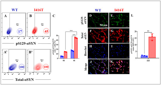 PSEN1 I416T DALNs increase levels of phosphorylated protein alpha synuclein (pS129-αSYN) after 11 days of transdifferentiation. Representative flow cytometry contour plots show intracellular pS129-αSYN in (A) WT PSEN1 and (B) PSEN1 I416T DALNs. Representative flow cytometry contour plots show total alpha synuclein protein (t-αSYN) in (A’) WT PSEN1 and (B’) PSEN1 I416T DALNs. (C) Percentage of pS129-αSYN/t-αSYN ratio. WT PSEN1 and PSEN1 I416T DALNs were stained with primary antibodies against pS129-αSYN (D,E), t-αSYN (F,G), Hoechst (H,I), and merged (J,K). Positive green fluorescence reflects the cytoplasmic presence of pS129-αSYN, positive red fluorescence reflects the cytoplasmic presence of t-αSYN protein, and positive blue fluorescence reflects nuclei. (L) Quantification of the pS129-αSYN/t-αSYN ratio mean fluorescence intensity (MFI). The figures represent one out of three independent experiments. One-way ANOVA followed by Tukey’s test. The data are presented as the mean ± SD of three independent experiments (n = 3); ** p < 0.002, *** p < 0.001. Bars in blue represent WT cells. Bars in red represent mutant cells. Image magnification, 200×.