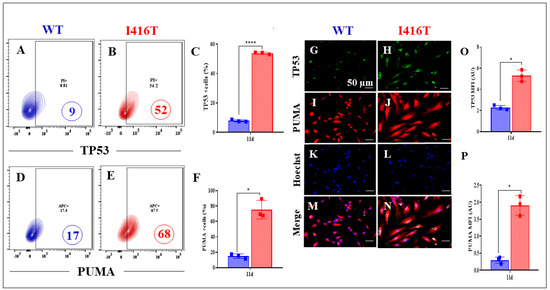 PSEN1 I416T DALNs increase levels of TP53 and P53 upregulated modulator of apoptosis (PUMA) after 11 days of transdifferentiation. Representative flow cytometry contour plots show TP53 protein level in (A) WT PSEN1 and (B) PSEN1 I416T DALNs. (C) Percentage of TP53 expression. Representative flow cytometry contour plots show P53 upregulated modulator of apoptosis (PUMA) protein in (D) WT PSEN1 and (E) PSEN1 I416T DALNs. (F) Percentage of PUMA. In addition, WT PSEN1 and PSEN1 I416T DALNs were stained with primary antibodies against TP53 (G,H), PUMA (I,J), Hoechst (K,L), and merged (M,N). Positive green fluorescence reflects the cytoplasmic presence of TP53 protein, positive red fluorescence reflects the cytoplasmic presence of PUMA, and positive blue fluorescence reflects nuclei. Quantification of the of (O) TP53 and (P) PUMA mean fluorescence intensity (MFI) in WT PSEN1 and PSEN1 I416T DALNs. The figures represent one out of three independent experiments. The data are presented as the mean ± SD of three independent experiments (n = 3). One-way ANOVA followed by Tukey’s test. The data are expressed as the mean ± SD; * p < 0.033, **** p < 0.0001. Bars in blue represent WT cells. Bars in red represent mutant cells. Image magnification, 200×.