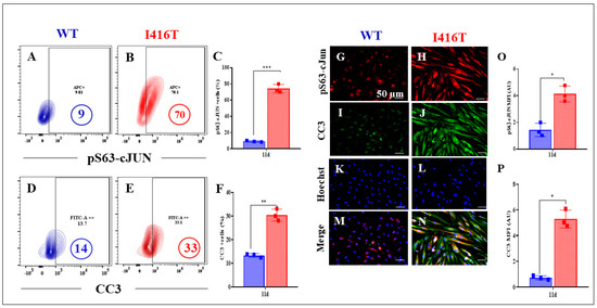 PSEN1 I416T DALNs increase levels of c-JUN phosphorylated at serine 63 (pS63-c-JUN) and cleaved caspase-3 (CC3) after 11 days of transdifferentiation. Representative flow cytometry contour plots show pS63-c-JUN protein level in (A) WT PSEN1 and (B) PSEN1 I416T DALNs. (C) Percentage of pS63-c-JUN expression. Representative flow cytometry contour plots show cleaved caspase-3 (CC3) protein in (D) WT PSEN1 and (E) PSEN1 I416T DALNs. (F) Percentage of CC3. WT PSEN1 and PSEN1 I416T DALNs were stained with primary antibodies against pS63-c-JUN (G,H), CC3 (I,J), Hoechst (K,L), and merged (M,N). Positive red fluorescence reflects the cytoplasmic presence of pS63-c-JUN, positive green fluorescence reflects the cytoplasmic presence of CC3, and positive blue fluorescence reflects nuclei. Quantification of the of (O) pS63-c-JUN and (P) CC3 mean fluorescence intensity (MFI). The figures represent one out of three independent experiments. One-way ANOVA followed by Tukey’s test. The data are presented as the mean ± SD of three independent experiments (n = 3); * p < 0.033. ** p < 0.02, *** p < 0.0002. Bars in blue represent WT cells. Bars in red represent mutant cells. Image magnification, 200×.