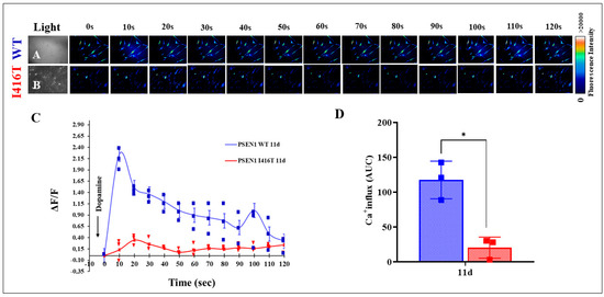 PSEN1 I416T DALNs exhibit dysfunctional Ca2+ influx response to dopamine (DA) at day 11 of transdifferentiation. Representative time-lapse images (0, 10, 20, 30, 40, 60, 70, 80, 90, 100, 110, 120 s) of Ca2+ fluorescence in response to DA (arrow) in (A) WT PSEN1 and (B) PSEN1 I416T DALNs. Color contrast indicates fluorescence intensity: dark blue < light blue < green < red. (C) Graph showing ΔF/F and (D) area under the curve (AUC). The figures represent 1 out of 3 independent experiments. One-way ANOVA followed by Tukey’s test. The data are presented as the mean ± SD of three independent experiments (n = 3); * p < 0.033,. Bars in blue represent WT cells. Bars in red represent mutant cells. Image magnification, 200×.