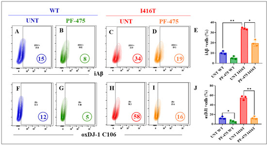 The LRRK2 inhibitor PF-06447475 (PF-475) blunts the expression of iAβ and oxidation of DJ-1 in PSEN1 I416T DALNs. Representative flow cytometry contour plots show intracellular amyloid-beta (iAβ) in (A,C) untreated or (B,D) treated cells with PF-06447475 LRRK2 inhibitor (PF-475). (E) Percentage of intracellular amyloid-beta (iAβ). (F–I) Representative flow cytometry contour plots show oxidized protein DJ-1 (DJ-1 C106-SO3). (J) Percentage of oxDJ-1 (DJ-1 C106-SO3). One-way ANOVA followed by Tukey’s test. The data are presented as the mean ± SD of three independent experiments (n = 3); * p < 0.033, ** p < 0.002.