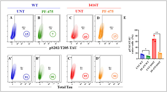 The LRRK2 inhibitor PF-06447475 reduces the levels of phosphorylated protein TAU (pS202/T205-TAU) in PSEN1 I416T DALNs. Representative flow cytometry contour plots show intracellular pS202/T205-TAU in (A,C) untreated or (B,D) treated cells with PF-475. Representative flow cytometry contour plots show total-TAU protein in (A’,C’) untreated or (B’–D’) treated cells with PF-475. (E) Percentage of p-TAU/t-TAU ratio in untreated or treated cells with PF-475. One-way ANOVA followed by Tukey’s test. The data are presented as the mean ± SD of three independent experiments (n = 3); * p < 0.033, and ** p < 0.002.