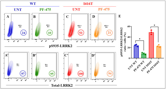 The LRRK2 inhibitor PF-06447475 reduces the levels of phosphorylated protein LRRK2 (pS935-LRRK2) in PSEN1 I416T DALNs. Representative flow cytometry contour plots show intracellular pS935-LRRK2 in (A,C) untreated or (B,D) treated cells with PF-475. Representative flow cytometry contour plots show total LRRK2 protein (A’,C’) untreated or (B’,D’) treated with PF-475. (E) Percentage of pS935-LRRK2/t-LRRK2 ratio untreated or treated cells with PF-475. One-way ANOVA followed by Tukey’s test. The data are presented as the mean ± SD of three independent experiments (n = 3); * p< 0.033.