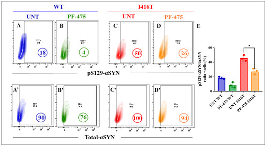 The LRRK2 inhibitor PF-06447475 reduces the levels of phosphorylated protein pS129-α-Syn in PSEN1 I416T DALNs. Representative flow cytometry contour plots show intracellular pS129-αSYN in (A,C) untreated or (B,D) treated with PF-475. Representative flow cytometry contour plots show total alpha synuclein protein (t-αSYN) in (A’,C’) untreated or (B’,D’) treated cells with PF-475. (E) Percentage of pS129-αSYN/t-αSYN ratio untreated or treated cells with PF-475. One-way ANOVA followed by Tukey’s test. The data are presented as the mean ± SD of three independent experiments (n = 3), * p < 0.033.