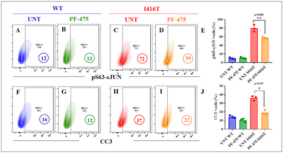 The LRRK2 inhibitor PF-06447475 reduces the levels of c-JUN phosphorylated at serine 63 (pS63-c-JUN) and cleaved caspase-3 (CC3) in PSEN1 I416T DALNs. Representative flow cytometry contour plots show pS63-c-JUN protein level in (A,C) untreated or (B,D) treated with PF-475. (E) Percentage of pS63-c-JUN expression in untreated or treated cells with PF-475. Representative flow cytometry contour plots show cleaved caspase-3 (CC3) protein in (F,H) untreated or (G,I) treated cells with PF-475. (J) Percentage of CC3 in untreated or treated cells with PF-475. One-way ANOVA followed by Tukey’s test. The data are presented as the mean ± SD of three independent experiments (n = 3); * p < 0.034, and ** p < 0.008.