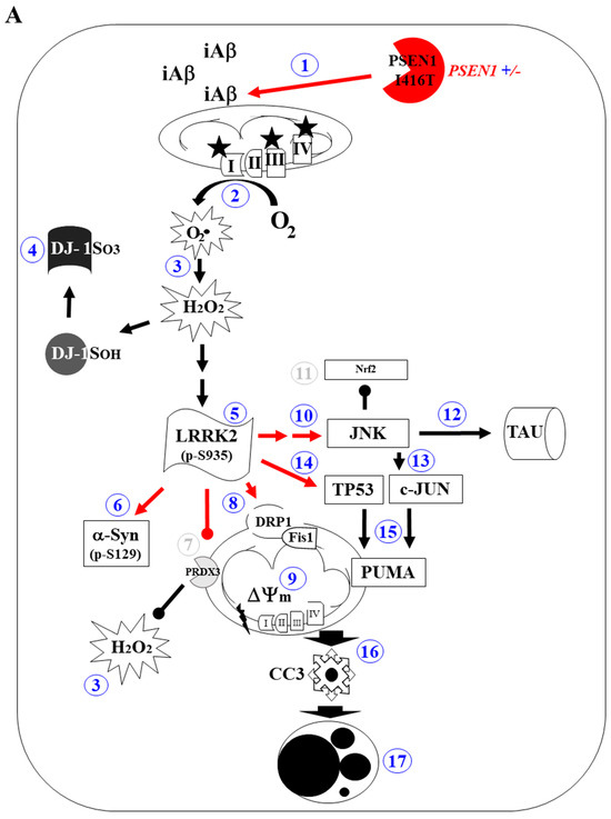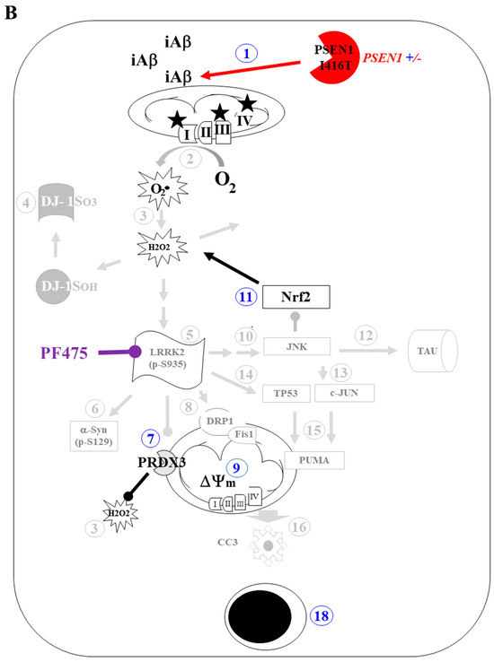 Schematic model of cell signaling induced by PSEN1/γ-secretase and effect of LRRK2 inhibitor PF475 in PSEN1 I416T DALNs. (A) PSEN1/γ-secretase signaling mechanism. The PSEN1+/- gene encodes a 467 aa catalytic and non-catalytic PSEN1 I146T protein that alters the metabolism of the type I transmembrane protein APP by a mechanism that is not fully understood, resulting in the overproduction of iAβ (1). The iAβ peptide acts on mitochondrial complex I (NADH: ubiquinone oxidoreductase), complex III (Q-cytochrome c oxidoreductase), or complex IV (cytochrome c oxidase) (2), interfering with the electron transport chain and simultaneously generating the anion superoxide (O2.-) and hydrogen peroxide (H2O2, 3). The latter is not only capable of oxidizing the stress sensor protein DJ-1Cys106-SH to DJ-1Cys106-SO3 (4), but also directly activates leucine-rich repeat kinase 2 (LRRK2) kinase directly through autophosphorylation or indirectly through kinase (e.g., via IKK) signaling (5). Once LRRK2 is phosphorylated at S935, the active pS935-LRRK2 kinase activates at least six major targets: (i) alpha-synuclein (αSyn) at the pathological residue S129 (6); (ii) inactivates protein peroxiredoxin 3 (PRDX3, 7), preventing H2O2 catalysis; (iii) activates the mitochondrial fission protein DLP-1 (dynamin-like protein 1, 8), which together with the fission protein-1 (Fis-1) receptor induces loss of mitochondrial potential (ΔΨm, 9); (iv) pS935-LRRK2 indirectly phosphorylates JNK (10), which, in turn, represses nuclear factor erythroid 2-related factor 2 (Nrf2)-associated expression of antioxidant proteins (11), phosphorylates the protein TAU (12), and activates c-JUN (13); (v) activates the transcription factors TP53 (14). Both pS63-c-Jun and TP53 factors transcribe PUMA (15), a Bcl-2-only protein involved in further mitochondrial depolarization (9). Impairment of mitochondrial potential leads to the release of apoptogenic proteins (e.g., cytochrome C), resulting in the production of cleaved caspase 3 (16), which is responsible for chromatin condensation and DNA fragmentation (17), a typical apoptotic feature in PSEN1 I416T DALNs. (B) Upon exposure to PF475, p-LRRK2-associated apoptosis signaling is drastically reduced (faint black line). As a result, PRDX3 activity is restored (7), Nfr2-induced antioxidant protein expression is increased (11), Aβ-induced ROS/H2O2 is decreased (2,3), and ΔΨm is increased (9). These actions result in global neuronal recovery and survival of PSEN1 I416T DALNs (18).