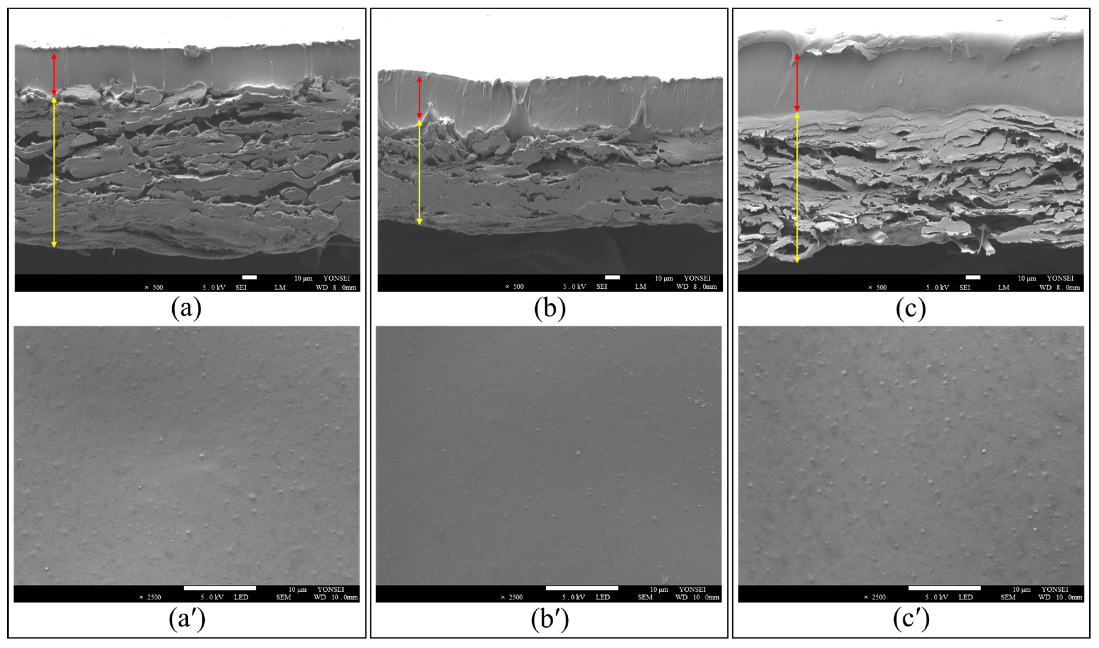 Cross-sectional and surface SEM images of the (a,a′) S0-coated paper, (b,b′) S1-coated paper, and (c,c′) S2-coated paper. The yellow line indicates the kraft paper (structural) layer, while the red line indicates the PEBAX or PEBAX/CA (coating) layer.