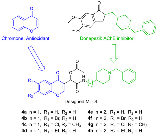 In accordance with this approach, several MTDLs were reported by Malek et al. in 2019 [24]. These compounds consist of a chromone moiety, which is responsible for the antioxidant effect, and a pharmacophore derived from donepezil, one of the first approved drugs for AD, which acts as an acetylcholinesterase inhibitor (AChEI) (Figure 1).