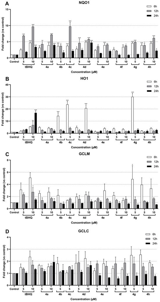 Although GCLM expression showed a minimal response to most compounds, the peak induction was observed after 6 h of treatment, including with tBHQ (Figure 3C). Only 10 µM tBHQ and 5 µM of compound 4g after 6 h caused significant inductions of approximately 3-fold and 5-fold, respectively. Interestingly, compound 4 h at both 5 µM and 10 µM demonstrated pronounced inductions of around 4-fold and 3.5-fold, respectively, although these results were not statistically significant. Conversely, GCLC did not exhibit any significant induction, regardless of the compound tested (Figure 3D).