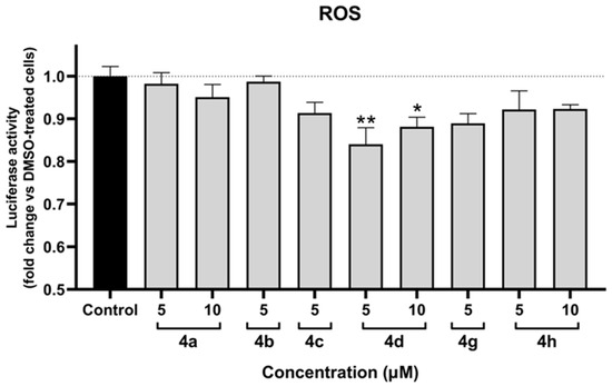 The antioxidant assay was performed in SH-SY5Y cells following 12 h of treatment. The assay was validated using the reference compound H2O2, 500 µM of which induced a 2-fold increase in ROS levels. As illustrated in Figure 4, only 4d exhibited statistically significant antioxidant effects. Notably, both tested concentrations of 4d demonstrated an effect, with 5 µM showing a stronger response than 10 µM. Additionally, 4g showed a tendency towards antioxidant activity; however, the results were not statistically significant.
