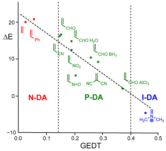 Recently, the crucial role of GEDT in TSs of P-DA reactions in reducing activation energies has been established [10], a behavior that constitutes the foundation of P-DA reactions, as first proposed in 2009 [9]. Figure 4 shows the plot of the relative energies of the TSs of five IMDA reactions vs. the GEDT computed at the corresponding TSs. As can be seen, a good linear correlation, R2 = 0.90, is obtained: the higher the GEDT, the faster the reaction. This graph, which is similar to that obtained for intermolecular DA reactions (see Figure 1), clearly differentiates N-IMDA, in red, P-IMDA, in green, and I-IMDA, in blue, reactions (see Figure 4).