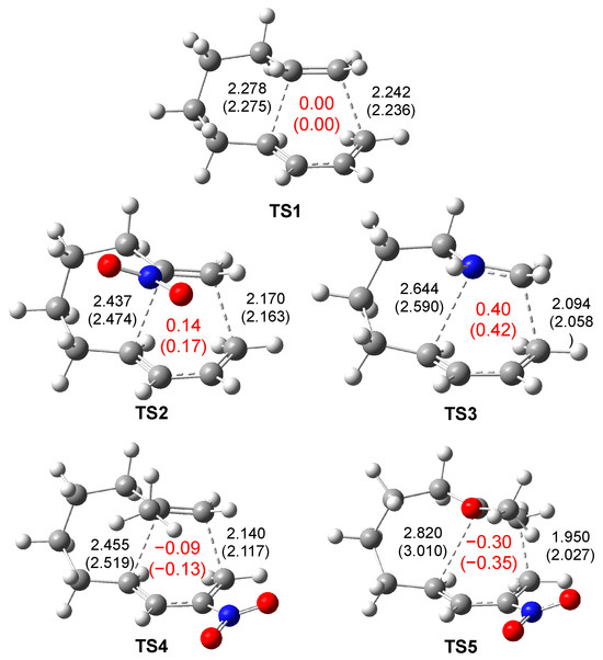 The present comparative analysis of the kinetic parameters of the five DA and IMDA reactions shows that the substitution on the unsaturated compounds involved in these cycloaddition reactions produces a similar effect on the kinetics of these reactions. However, the IMDA reactions are approximately 104 times faster than the intermolecular DA reactions because of the less unfavorable activation entropies associated with the intramolecular processes (see Tables S3 and S4 in the Supplementary Materials). This behavior reduces the activation Gibb free energies associated with the intramolecular reaction by 4.5 and 8.5 kcal·mol−1 compared to the intermolecular ones (see Table 4).