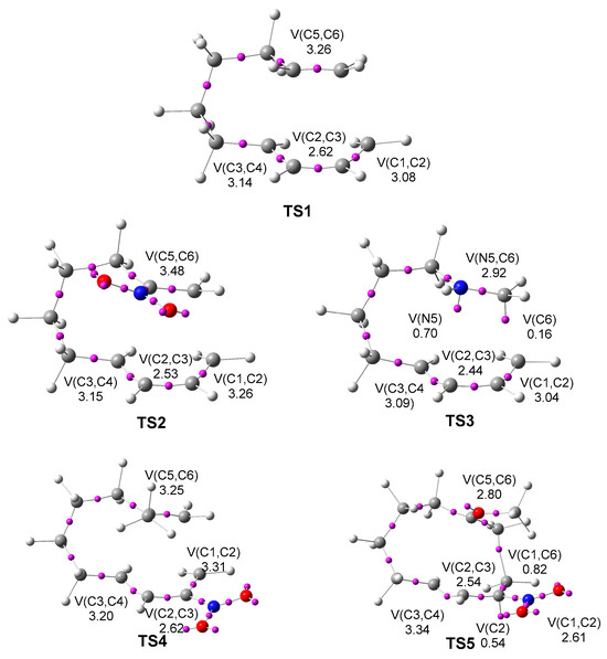ELF basin attractor positions and the populations of the most relevant valence basins of TS1–TS5, calculated at the M06-2X/6-311G(d,p) level in the gas phase.