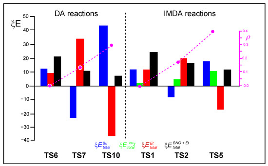 Graphical representation of the sets of the M06-2X/6-311G(d,p) total energies, ξ, ξ, ξ, ξ and the ξ for the TSs. The ξ and ξ energies correspond to the RIAE activation energies of these DA and IMDA reactions, respectively. ξ energies for the Bu, Et and CH2 frameworks are shown in blue, red and green, respectively, while the black bar represents the ξ and ξ energies. ξ energies are reported in kcal mol−1. The GEDT values at the TSs, displayed in pink, are expressed as an average number of electrons e.