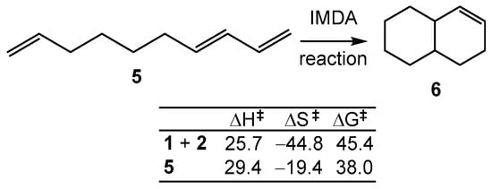 On the other hand, the intramolecular processes allow for the reduction of the unfavorable negative activation entropy associated with bimolecular processes. Scheme 2 shows the thermodynamic data for the N-DA reaction between butadiene 1 and ethylene 2 shown in Scheme 1, along with those for the intramolecular Diels–Alder (IMDA) reaction of (E)-deca-1,3,9-triene (DTE) 5 [11]. The B3LYP/6-311G(d,p) activation enthalpy for the N-DA reaction of 1 with 2, ΔH≠ = 25.7 kcal·mol−1, and the computed activation entropy, ΔS≠ = −44.8 cal·mol−1·K−1, were close to the experimental values, 27.5 kcal·mol−1 and −40.6 cal·mol−1·K−1, respectively [6,7]. These high values raise the activation Gibbs free energy to 45.4 kcal·mol−1 at 165 °C (see Scheme 2). Despite the fact that the computed activation enthalpy associated with the IMDA reaction of 5, ΔH≠ = 29.4 kcal·mol−1, is higher than that associated with the intermolecular one, the lower activation entropy associated with this intramolecular process, ΔS≠ = −19.4 cal·mol−1·K−1, reduces the activation Gibbs free energy to 38.0 kcal·mol−1. This behavior explains the feasibility of non-polar IMDA reactions.